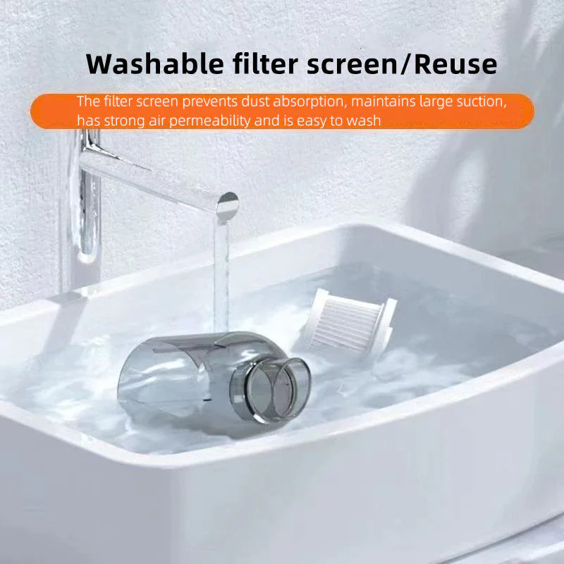 The HEPA filter is washable and reusable, which keeps dust and dirt out to avoid blockage. Take the filter out of the dust cup of the vacuum cleaner, wash it with water and dry it for second use. (Using tip: If the vacuum filter is full of dirt or suction weakness, please clean the filter in time to make sure the dust buster can work normally).